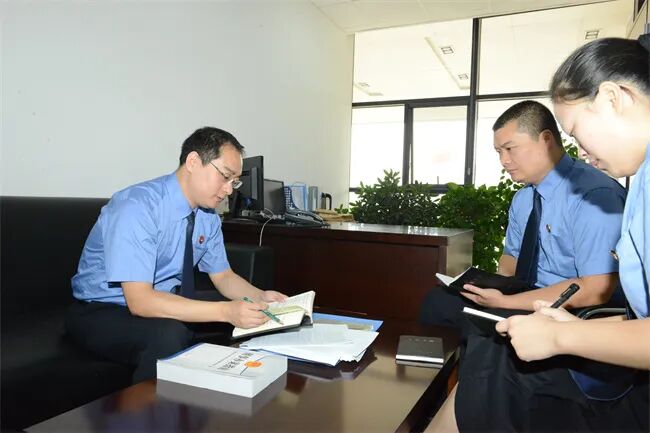 河南省巩义市检察院检委会原专职委员、第二检察部原主任张晓鹏(左一)与同事讨论案件