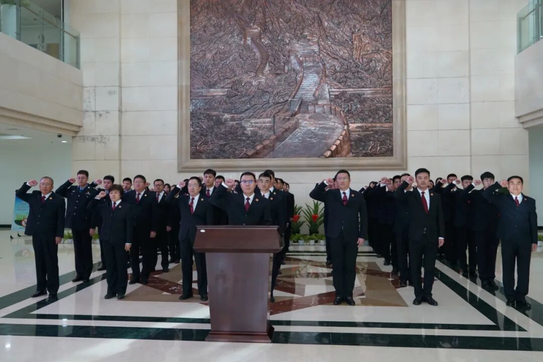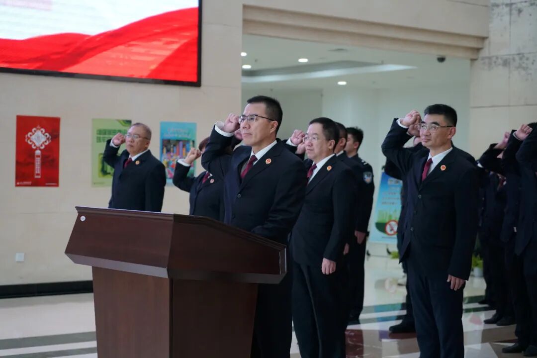 “我宣誓:忠于中华人民共和国宪法,维护宪法权威,履行法定职责,忠于祖国、忠于人民,恪尽职守、廉洁奉公,接受人民监督,为建设富强民主文明和谐美丽的社会主义现代化强国努力奋斗!” 宣誓仪式上,盘锦市人民检察院党组书记、代理检察长苏中辉左手抚按《中华人民共和国宪法》,右手举拳,领诵誓词,全体检察干警整齐跟诵。字字铿锵有力,句句慷慨激昂,每位宣誓人员都心潮澎湃,热血沸腾,用铮铮誓言表达对宪法的尊祟、对法治的信仰和对人民的承诺。